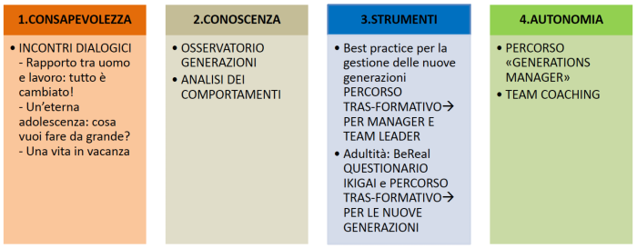 Per gestire al meglio le nuove generazioni e favorire relazioni di qualità tra persone appartenenti a generazioni diverse Execo propone un percorso costituito da più fasi, ciascuna con uno o più interventi.