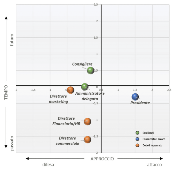 - Focalizzazione temporale: passato vs futuro (orientamento verso l’analisi dei risultati storici e delle esperienze pregresse rispetto alla proiezione verso l'innovazione e il cambiamento).