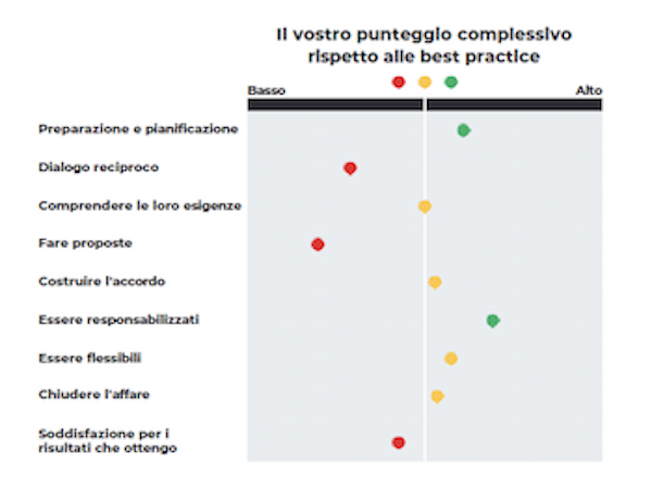 Quanto è efficace la negoziazione del vostro team o della vostra organizzazione? Siete al di sotto, alla pari o al di sopra del nostro benchmark globale di best practice? In che cosa siete veramente bravi e in che cosa siete carenti? L'assessment online di scotwork vi dice quanto è capace la vostra organizzazione e dove e come massimizzare le vostre performance negoziali. Sottoponendoti all'assessment, otterrai 50 punti critici di comportamento e di stile negoziali relativi a: